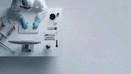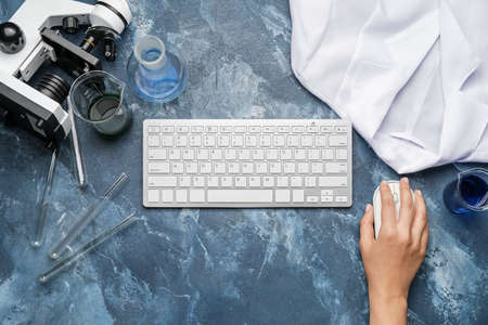 Top view of scientist working in laboratory. Healthcare and medical concept.