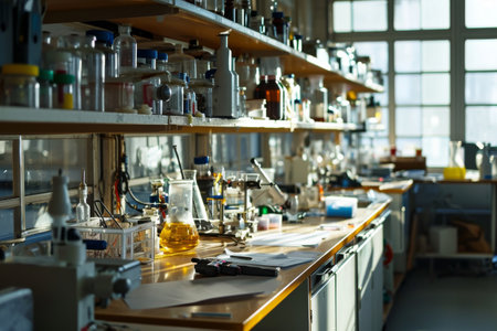 A well-organized laboratory is equipped with glassware and a microscope, illuminated by natural light streaming through large windows, showcasing a productive research environment.