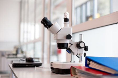 Electric microscope binoculars in a science lab isolated shallow depth of field 2020