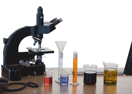 Laboratory glassware and microscope on table in laboratory. Science and technology concept