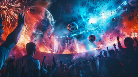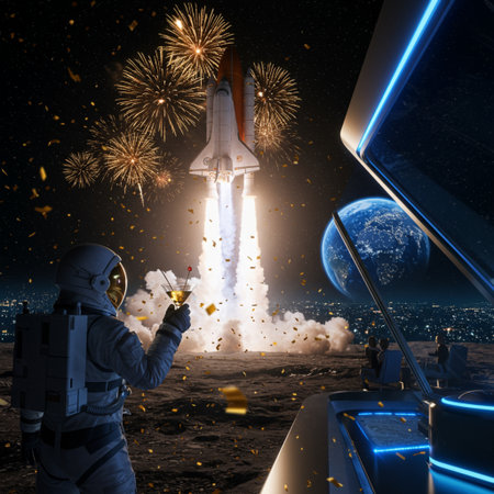 Astronauts in space suits celebrate the New Year with a fireworks display in front of galaxies. The image displays a digital composition with a surreal atmosphere. Visual elements include vibrant colors, cosmic background, and futuristic aesthetics. Suitable for use in conceptual projects, science fiction illustrations, or promotional material.