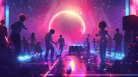 Costume party, Space Odyssey: Futuristic costumes, astronauts mingling under starry lights, drinks and music.