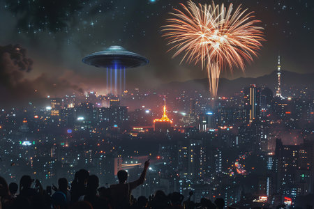 A colossal spaceship descends onto a landing pad, its glowing engines illuminating the twilight scene as onlookers stand in awe, signifying an advanced spacefaring civilization.. AI Generation