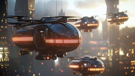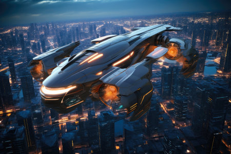 A detailed digital rendering of a fleet of futuristic UFOs hovering above a modern cityscape, showcasing advanced technology and a sense of mystery.