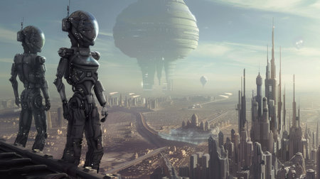 Futuristic cityscape with two humanoid robots towering over the city, large hovering structures in the sky and tall, sleek buildings