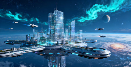 A high-energy 3D background of an intergalactic space station, orbiting a distant exoplanet. Transparent tunnels connect various futuristic buildings, while spaceships of all shapes and sizes dock at the massive docking bay.