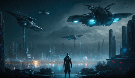 Cyberpunk city at night, man looks at futuristic buildings and spacecraft, generative AI. Urban scene with cyberspaceport. Concept of the future, metaverse, technology, game, sci-fi, space.
