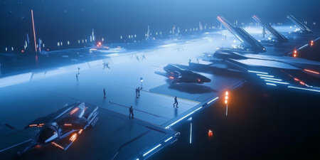 A futuristic spaceport with sleek spaceships docking, glowing lights illuminating the area, and astronauts preparing for launch. The advanced and dynamic setting inspires exploration.