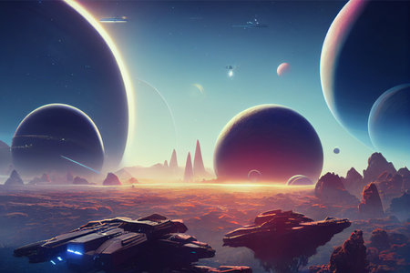 intergalactic spaceships on the background of planets and space. high quality illustration