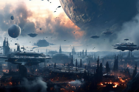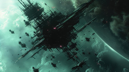 Futuristic sciFi huge battle spaceships. Futuristic sciFi huge battle spaceships concept for futuristic interstellar deep space travel for sci-fi backgrounds. Generative Ai.