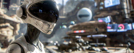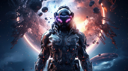 Futuristic astronaut robot in space with glowing lights and cosmic background. Concept of advanced space technology and exploration.