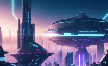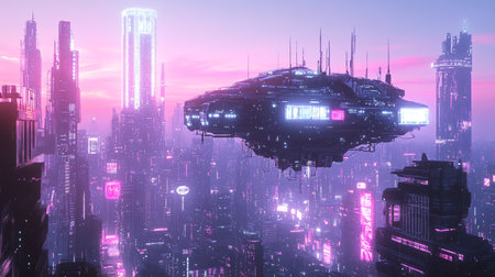 Futuristic cityscape with glowing neon lights, advanced skyscrapers, and hovering vehicles in a high-tech urban skyline