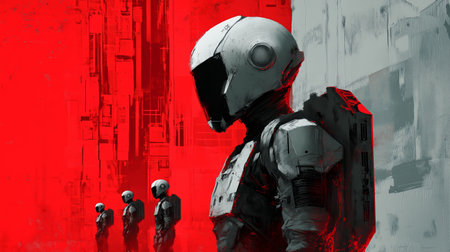 Futuristic soldiers stand in formation against a vibrant red backdrop in a dystopian environment