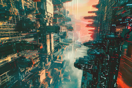 Futuristic cyber punk architecture with cityscape background.