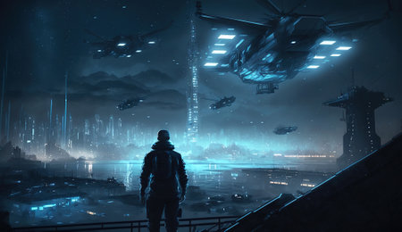 Cyber city at night, man looks at futuristic buildings and spacecrafts, generative AI. Urban scene with cyberpunk spaceport. Concept of the future, metaverse, technology, game, sci-fi, space.
