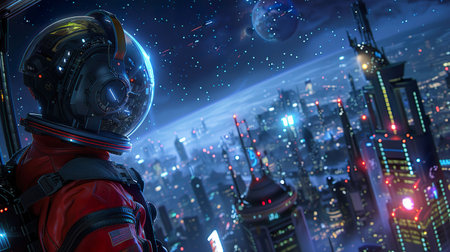 Sci-Fi Adventure, Space Suit, Futuristic cityscape, Discovering an alien planet, Starry night sky, Photography, Backlights, HDR, Close-up shot
