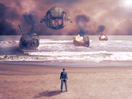 Attack of combat robots in futuristic battle at war. Science fiction concept and cyberpunk. 3D rendering