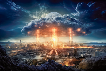 Nuclear bomb explosion, mushroom cloud over cityscape
