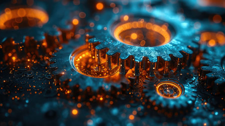 Intricate metal gears are interlocked closely, surrounded by a rich blue and orange glow that highlights their details in a dark setting, creating a captivating visual effect.