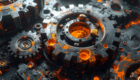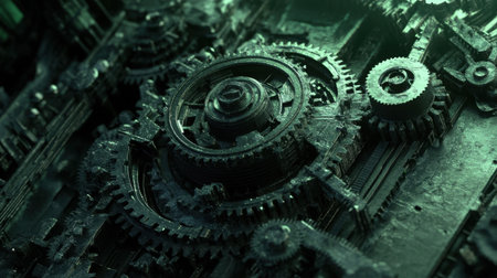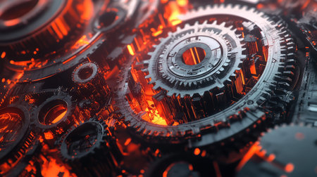 Detailed view of complex gears and cogs working together to power machinery, showcasing intricate mechanisms in a digital world.