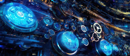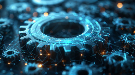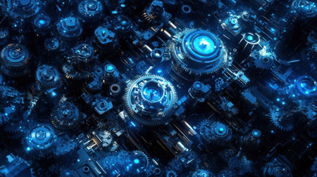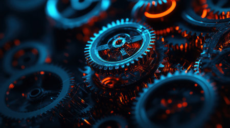 A network of intricate gears glows with a vibrant blue light, symbolizing the seamless integration of advanced technology and engineering.