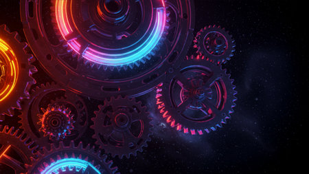 Vibrant close-up of colorful gears and mechanical elements illuminated by neon lights, ideal for technology and industrial themes. Perfect for creative projects.