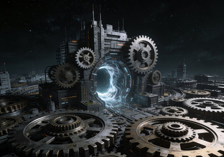 An intricate system of gears, some highlighted with luminous outlines, forms the central subject. The composition features a modern digital design aesthetic with a complex arrangement against a blurred backdrop suggesting an urban environment. This image could be used for illustrating technology, engineering, or conceptual themes in various media.
