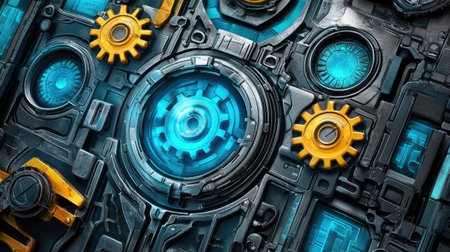 Futuristic Technology Background with Blue Gears and Circuit Board Elements in High-Tech Industrial Design