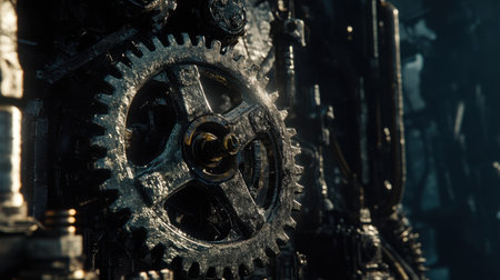 Explore a captivating close-up view of intricate mechanical gears and textures set against a dark and atmospheric background, showcasing industrial design.