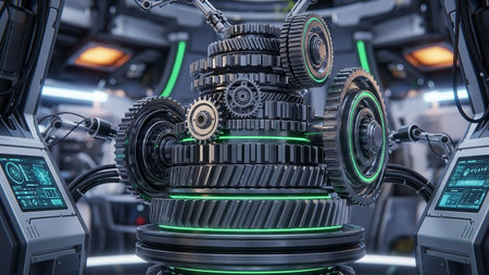 3D engine gears in a close-up view, showcasing intricate details that represent cutting-edge technology and innovation. The metallic textures and precise design emphasize the fusion of art and engineering