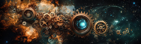 A mesmerizing display occurs as intricate steampunk gears and cogs intertwine with colorful cosmic elements, creating a stunning visual of space and machinery.