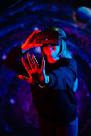 A young girl using a virtual reality helmet plays. Neon red and blue lights on a space background. Holding hand outstretched forward, stop sign.