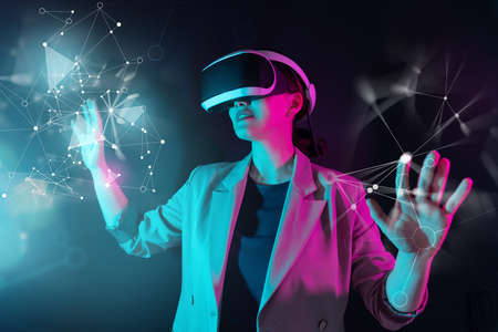 Female person using Virtual reality headset in metaverse universe. Experiencing virtual reality internet metaverse