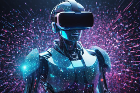 3D rendering of a female robot wearing virtual reality goggles with bokeh background