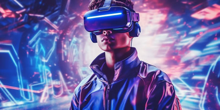 Man in VR heads goggles plays in neon, futuristic background space. AI Generated. High quality illustration