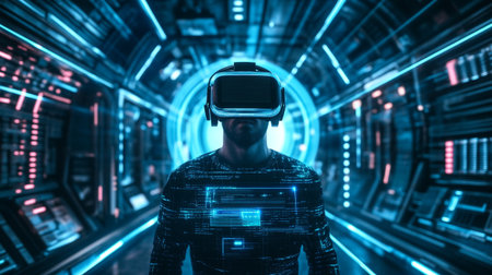 man wearing virtual reality glasses created with generative AI technology. High quality illustration