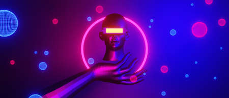 Vr helmet virtual reality. Model young in digital glasses for virtual reality technology isolated on dark neon background. Augmented reality, game, future technology concept. VR