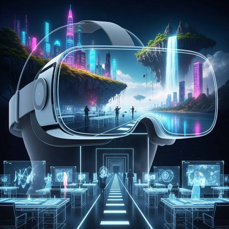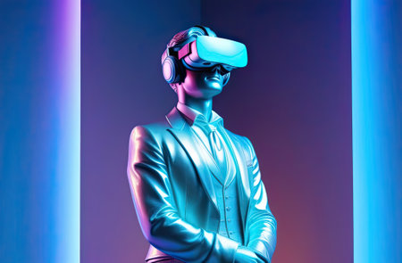 metaverse vr world simulation gaming cyberpunk style, digital robot ai, 3d illustration rendering, virtual reality device