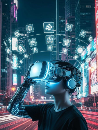 Person wearing VR headset in neon city with digital icons