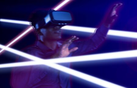 Man in a virtual reality helmet. Neon room with VR games.