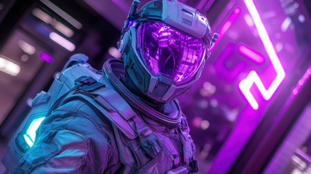 A captivating futuristic astronaut stands in a neon-lit space, showcasing vibrant colors and advanced technology, perfect for a sci-fi theme or exploration concept.
