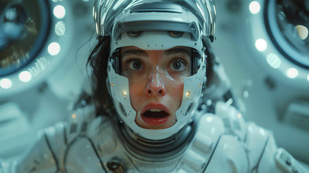 Female astronaut in spacesuit checks wrist device inside spacecraft doing human expansion in space. Starship crew member prepares for operations supporting long term mankind survival