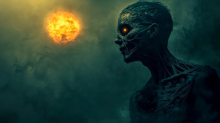 a zombie with yellow eyes stares menacingly in this backlit, vray-traced photograph. the dark gold and aquamarine tones create an explosive and chaotic atmosphere, capturing the essence of manapunk and suburban ennui. this uhd image showcases the intricate details of the zombie's haunting gaze. ai generated