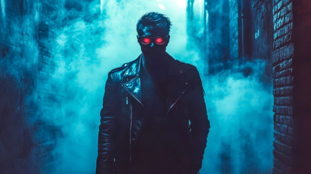 Cyberpunk man wearing futuristic glasses and leather jacket walking in smoke