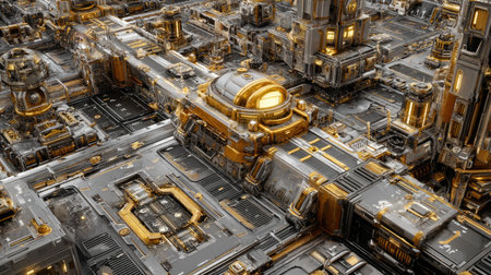 Explore a futuristic metallic cityscape filled with geometric structures and luminous accents, showcasing advanced technology in a visually appealing digital environment.