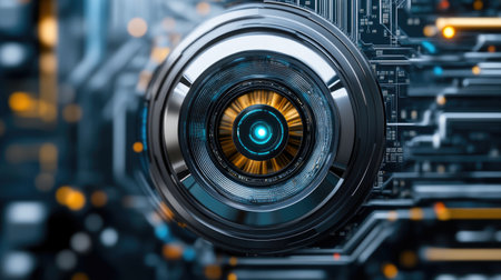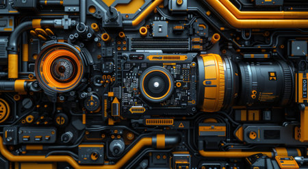 This image features a close-up of a futuristic technological background showcasing glowing circuits and metallic elements with striking orange highlights.