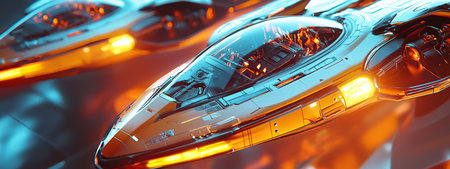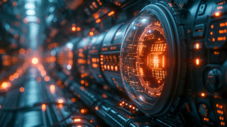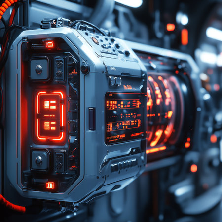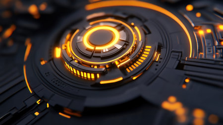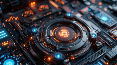 A close-up view of a futuristic interface with glowing orange lights and digital displays.