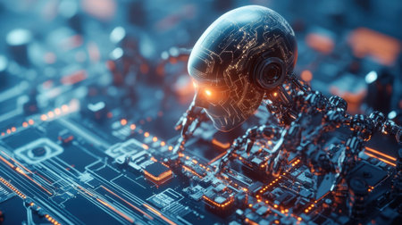 A surreal depiction of a futuristic robot head integrated into a circuit board, featuring glowing lights and complex technology elements, representing advanced robotics and artificial intelligence.
