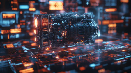 Futuristic technology scene. Intricately designed computer components in a high-tech setting, highlighted by vivid colors.