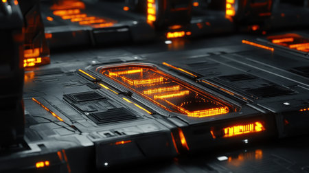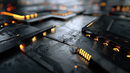 Explore a captivating futuristic technology background showcasing a dark metal surface enhanced with striking glowing orange accents, perfect for sci-fi concepts.